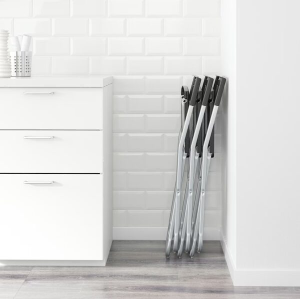 Krzesło składane w kolorze czarnym na srebrnym stelażu.